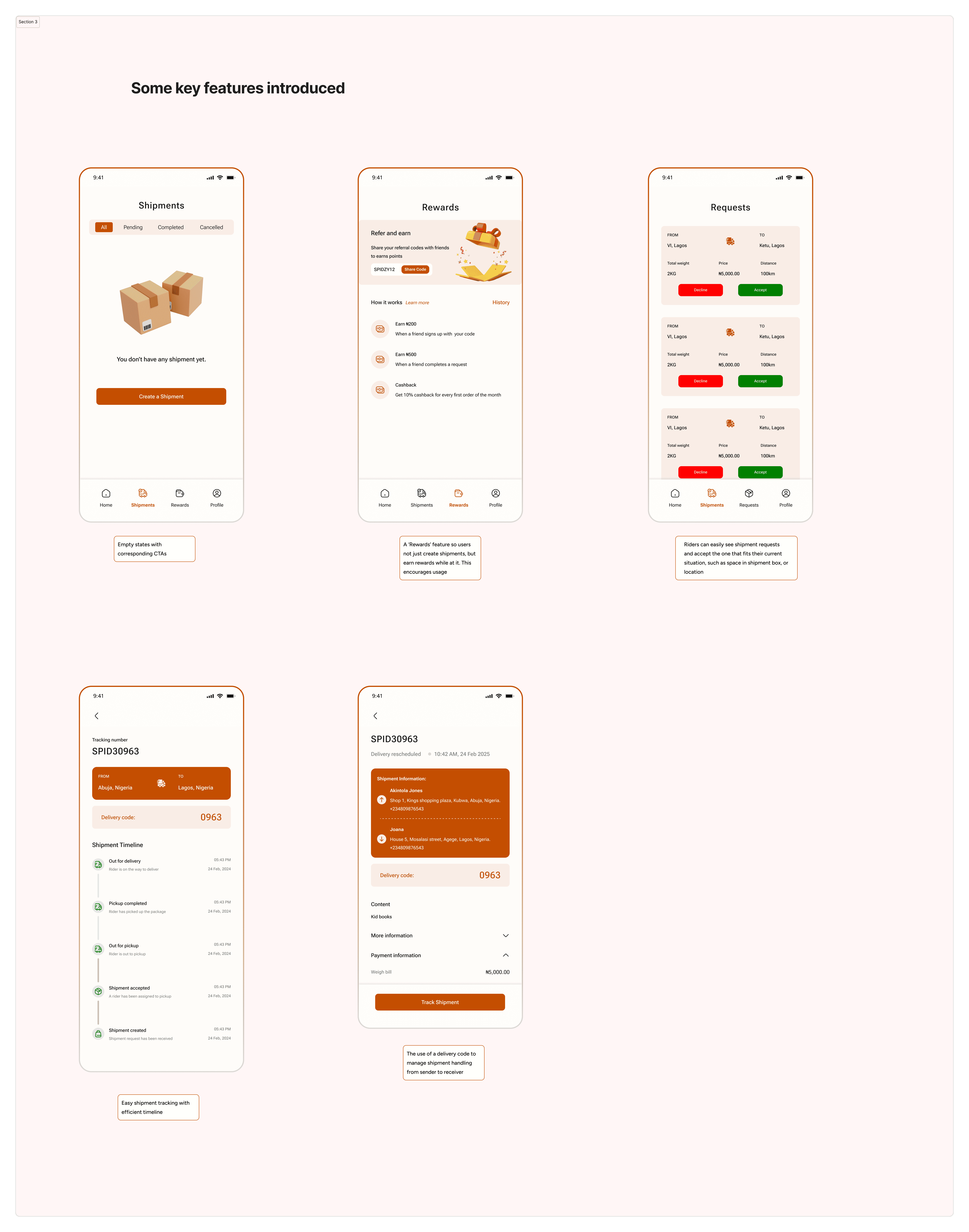 To achieve this, I modernized the visual language, clarified interactions, and redesigned core flows, onboarding, shipment creation and tracking, and the homepage, to align with users’ mental models of how deliveries are typically booked. Each screen was intentionally designed to reduce cognitive load, surface primary actions early, and guide users smoothly from intent to completion.